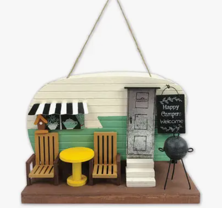 Add fun and whimsy to any room with the retro designed Shasta Camper Trailer Decorative Birdhouse. This adorable design features a mini camper with a table and chairs, a black-and-white awning, a grill—even a mini birdhouse! The rope string makes it easy to hang on a tree or the back porch. A great gift idea for the outdoor lover! Decorative only. Hand-crafted & detailed. Free standing or hang, jute rope included. Features a table and chairs, a grill. Front entrance, rear clean out.