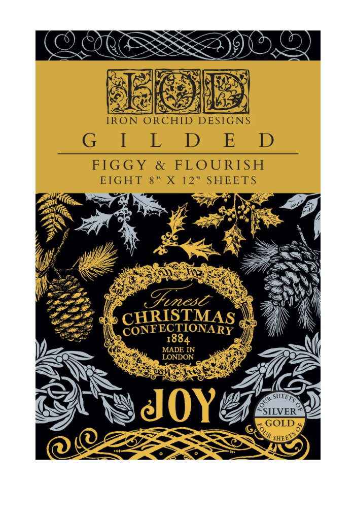 Meet Figgy & Flourish, our most luxe holiday gilded transfer yet, and yes, it’s gleaming with both gold and silver details! Inspired by old book cover foiling, printer’s ornamentation, and vintage labels, this festive beauty is glistening.