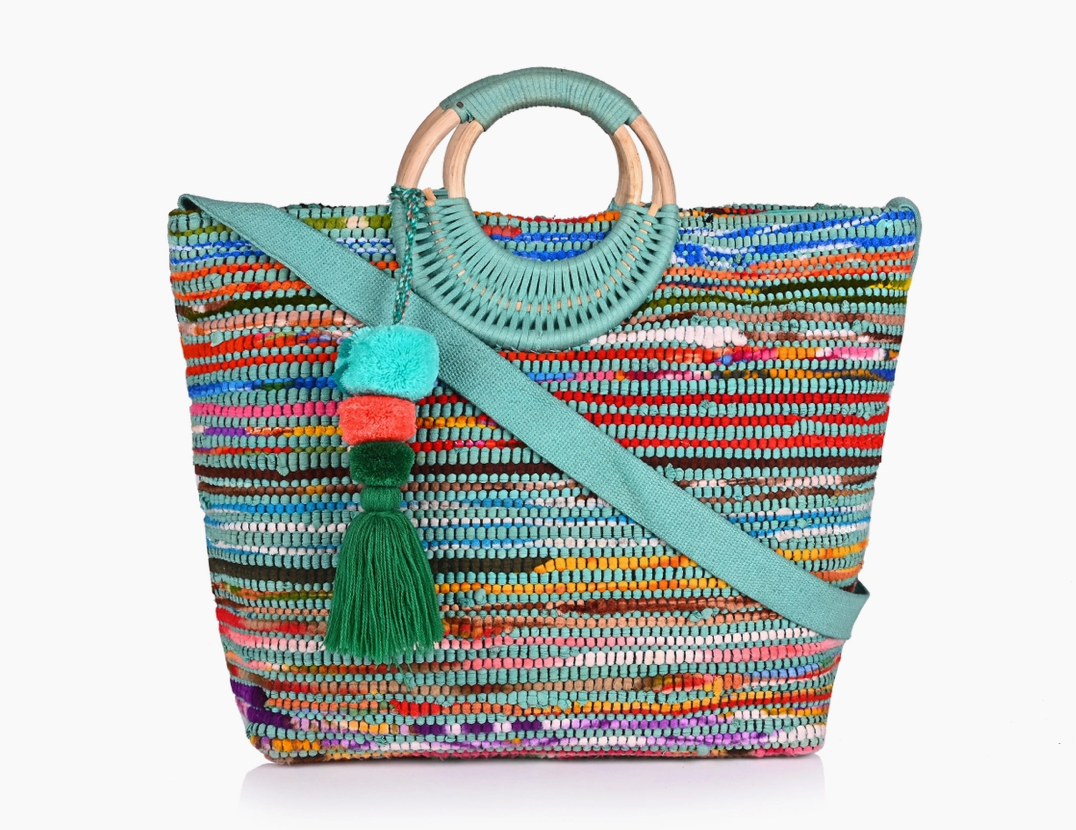 Multi-purpose tote, made by handweaving leftover fabric, lined interiors, magnet closure, zip pocket inside with a mobile pocket, long strap attached, macrame wicker handles, multi-color tassel charm attached.