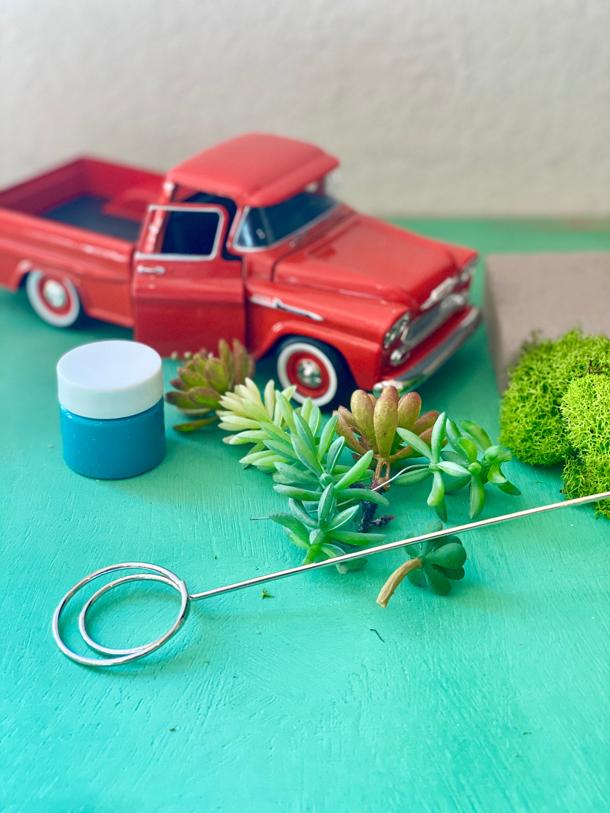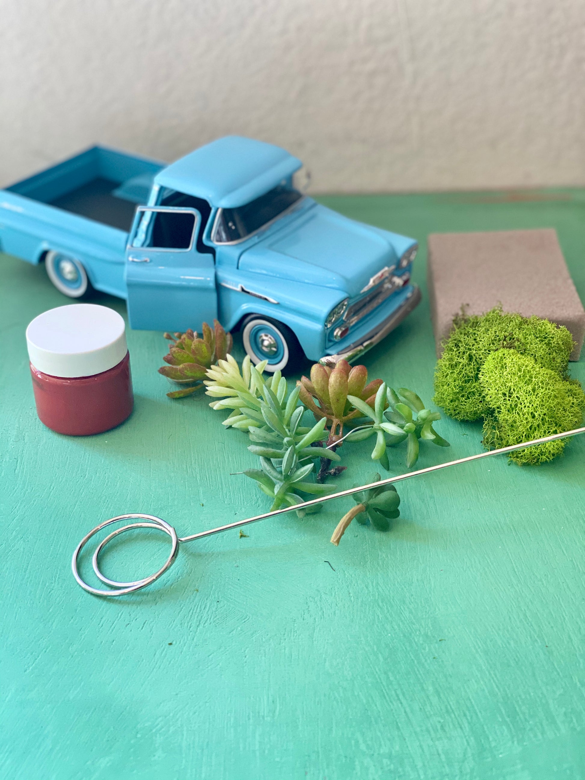 kit comes with, 1/2 oz paint, 1/4 oz clear wax, floral foam, photo holder, moss and truck.