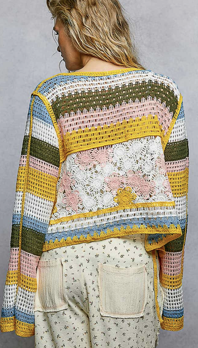 Long Sleeve Crochet Striped Tie Closure Open Cardigan Top