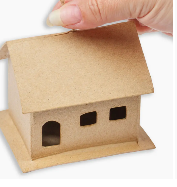 Paint these Paper Mache House Ornaments to place in tiny towns, train set displays, and Christmas trees, or create a sweet decoration for a table or shelf. The houses will arrive premade and ready to use....no bending or folding needed