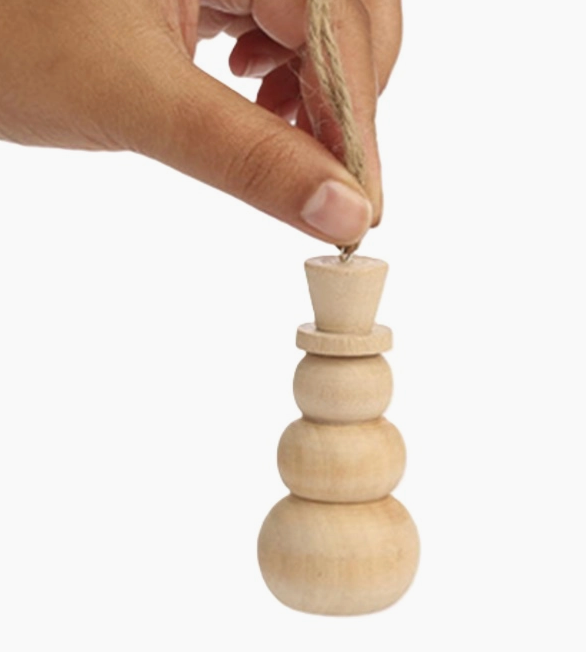 This Unfinished Wood Snowman Ornament makes a charming addition to winter décor and craft projects. Paint or embellish to suit any style or leave it natural to showcase its handmade Scandinavian character. Size: 3-1/4" H x 1-1/4" Dia. The ornament has a jute string threaded through a small metal eyelet atop the hat, making it easy to hang on a tree or anywhere you choose. The flat base allows it to stand upright, perfect for tabletop or shelf display.