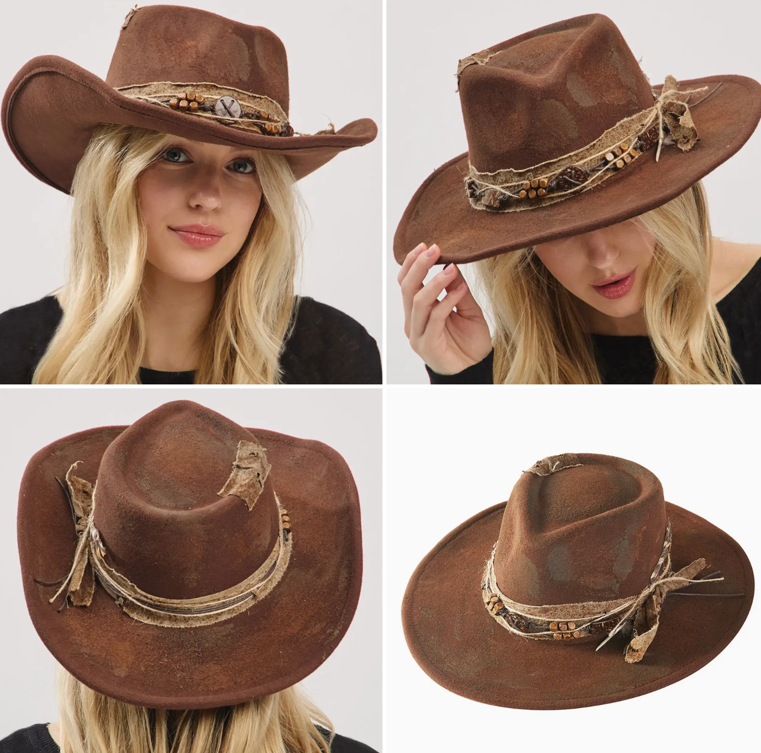 Size : One Size Material : 100% Polyester Western-style hat featuring a rugged, distressed finish and rustic bead-accented band. Ideal for themed events or adding a bold, vintage flair to casual or outdoor looks.